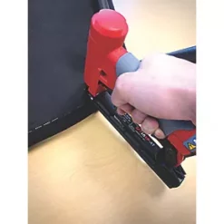 Pneumatic fine wire stapler driving 21 gauge staples ranging in length between 4 and 16mm. Suitable for a wide variety of applications such as upholstering operations, furniture assembly, moulding and roofing felt, and bedding manufacture. Heavy-duty steel cap. Superior balance with minimal recoil. One-handed magazine opening ensures increased productivity with less downtime. Rear exhaust directs oil and dust away from the work surface. Comfort grip reduces fatigue. Short trigger stroke for quick and precise operation.